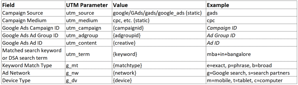 | utm_source=gads&utm_medium=cpc&utm_campaign={campaignid}&utm_adgroup={adgroupid}&utm_content={creative}&utm_term={keyword}&g_mt={matchtype}&g_nw={network}&g_dv={device} |