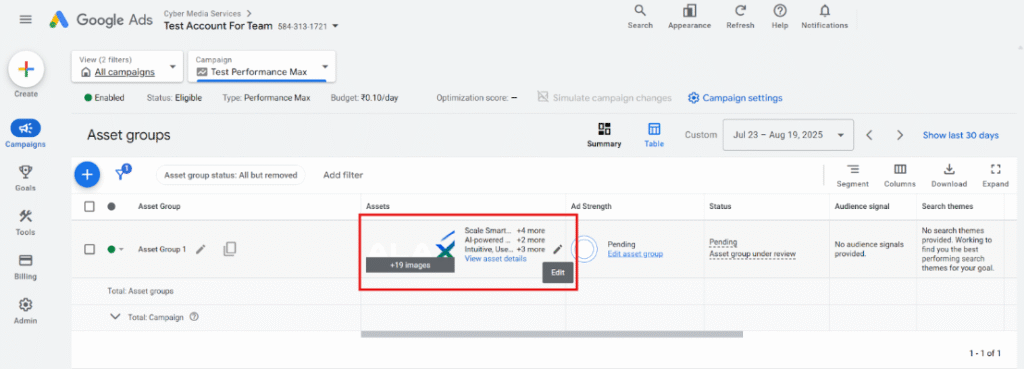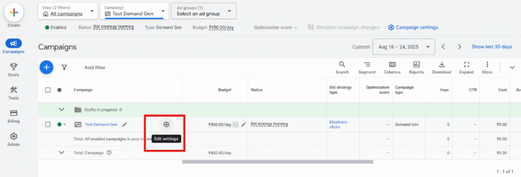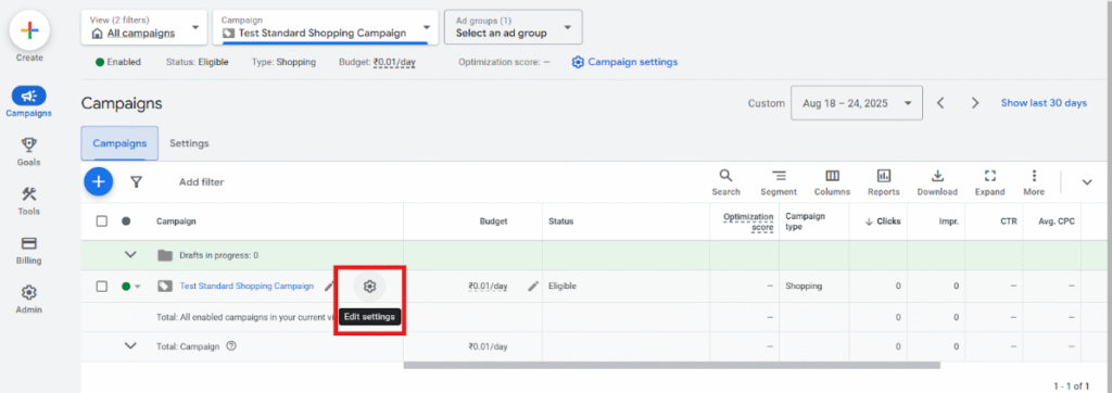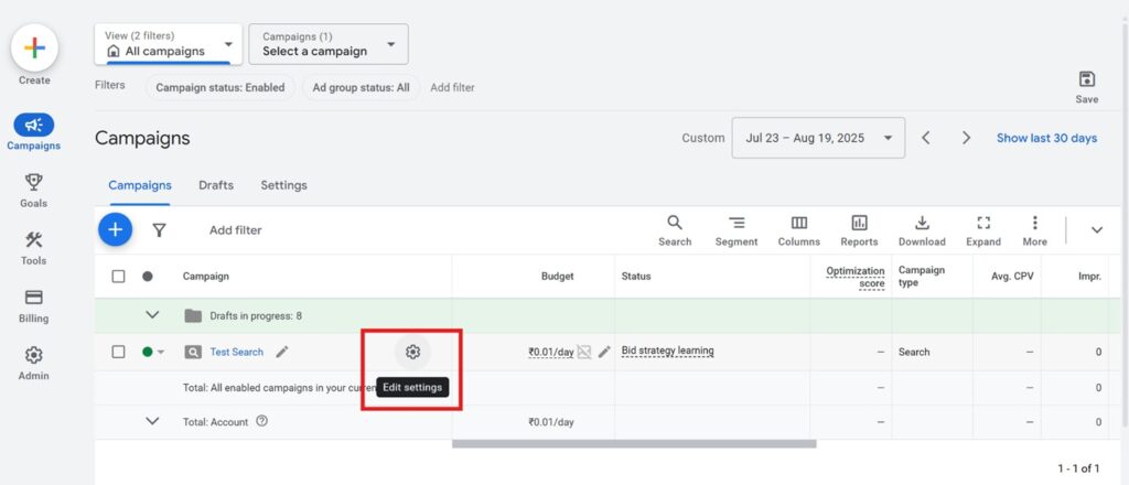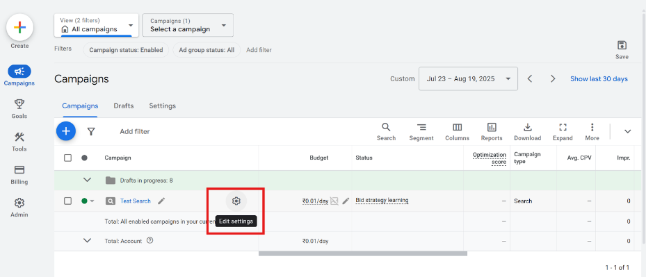 Step 1: Click on Edit Settings of the Search Campaign