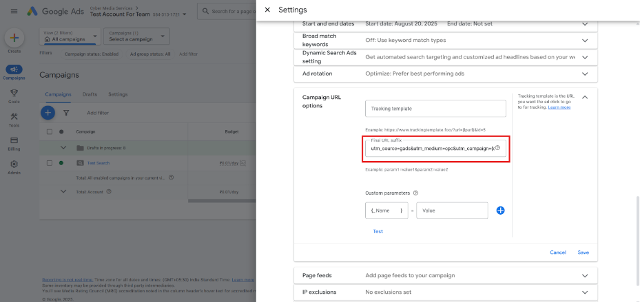 Step 3: Paste the UTM parameters shared for Search Campaign in the Final URL suffix, as shown below