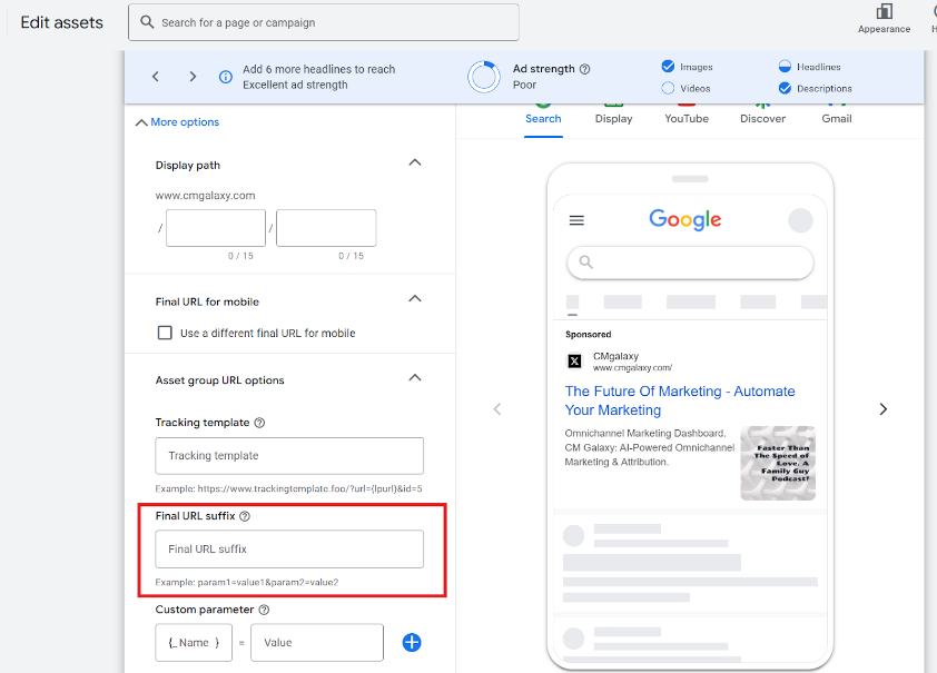 Step 2: Navigate to Other Options -> Final URL suffix, located at the very end of the Edit assets.