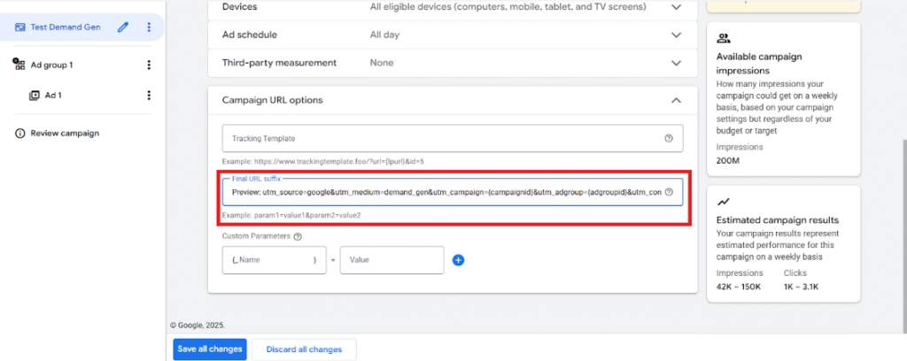 Step 3: Preview: utm_source=google&utm_medium=demand_gen&utm_campaign={campaignid}&utm_adgroup={adgroupid}&utm_content={creative}&g_nw={network}&g_dv={device}&g_pid={product_id}