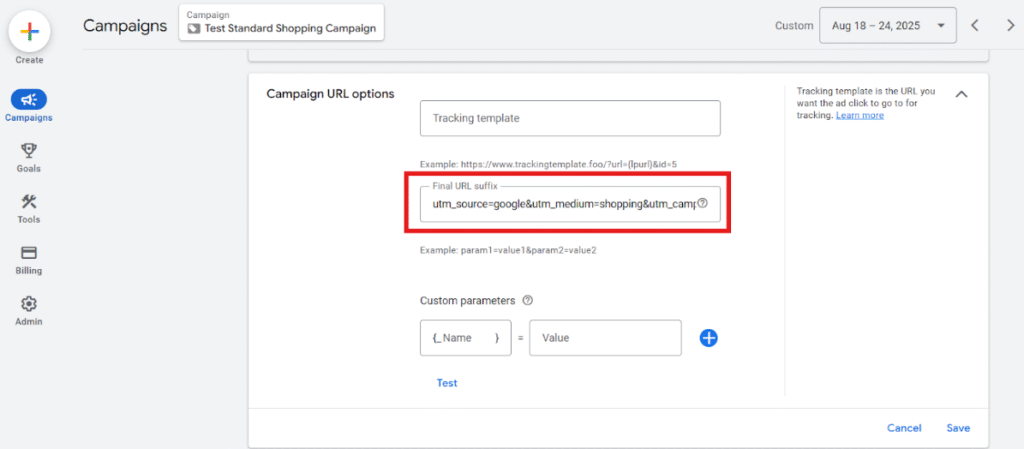 Step 3:Paste the shared UTM parameters for the Performance Max Campaign into the Final URL Suffix, placing the Asset Group ID copied in Step 0 after “utm_assetgroup=“, as shown below.